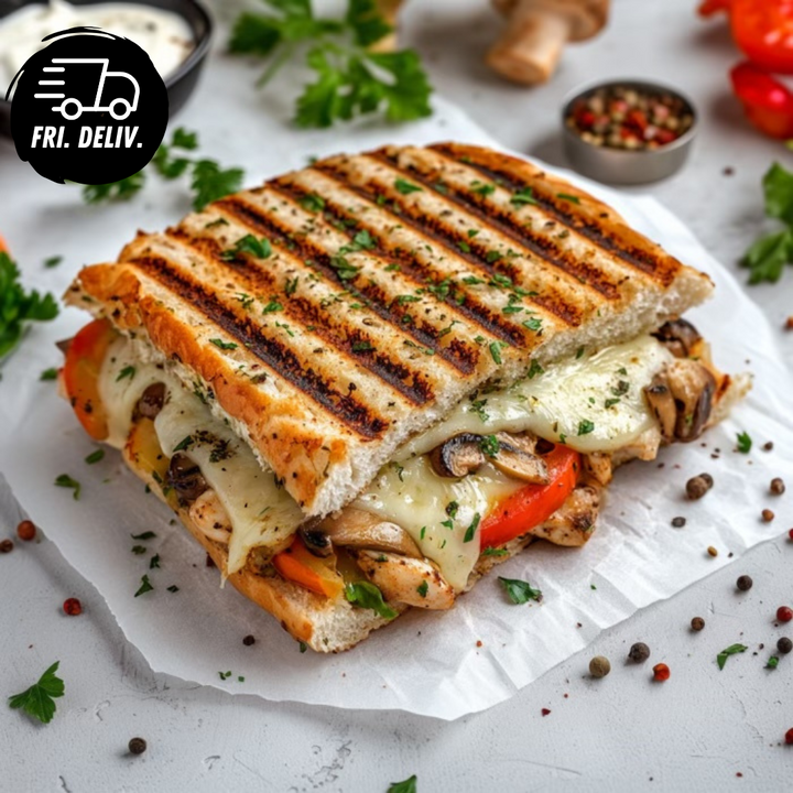 Ingredients: Chicken Breast, Panini Bread, Provolone Cheese, Cheddar Cheese, Mushroom, Red Capsicum, Onion, Aioli Sauce, Worcestershire Sauce, Olive Oil, Salt, Black Pepper.