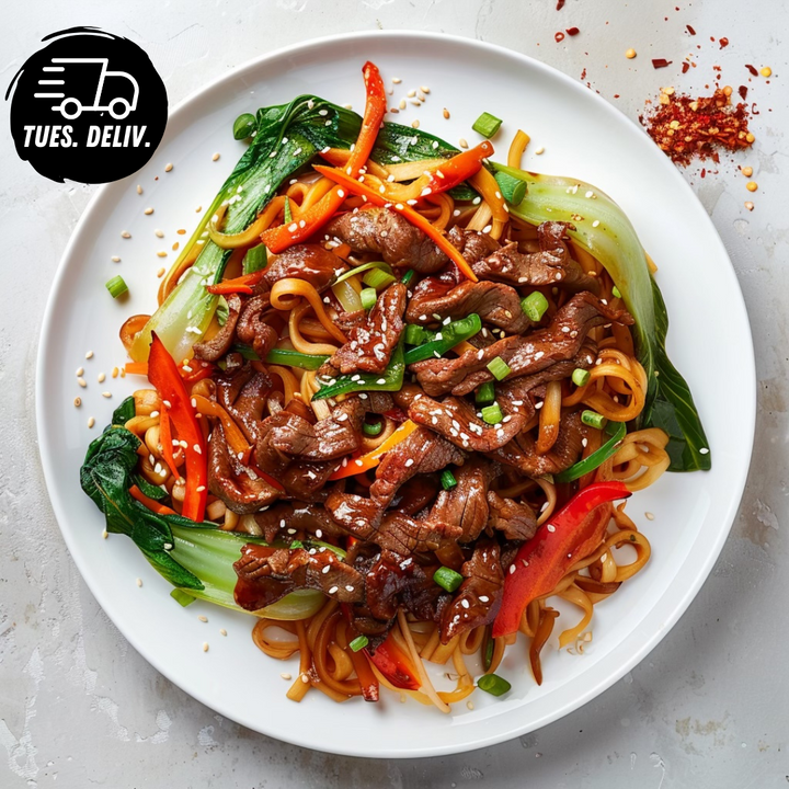 Savour the bold, savoury flavours of this Asian-inspired favourite. Tender strips of beef are stir-fried to perfection, coated in a rich and slightly sweet Mongolian-style sauce that balances soy, garlic, and ginger with subtle umami depth.