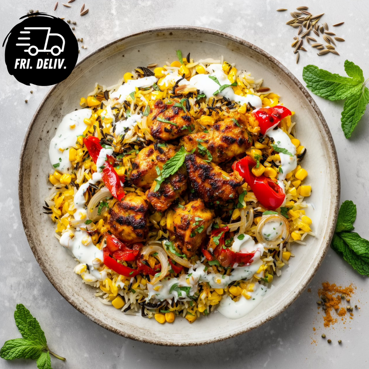 Ingredients: Chicken Breast, Basmati Rice, Red Capsicum, Green Peas, Corn Kernels, Natural Greek Yoghurt, Fresh Mint, Garlic, Olive Oil, Lemon Juice, Paprika, Chilli, Cumin, Parsley, Spring Onion, Salt, Black Pepper.