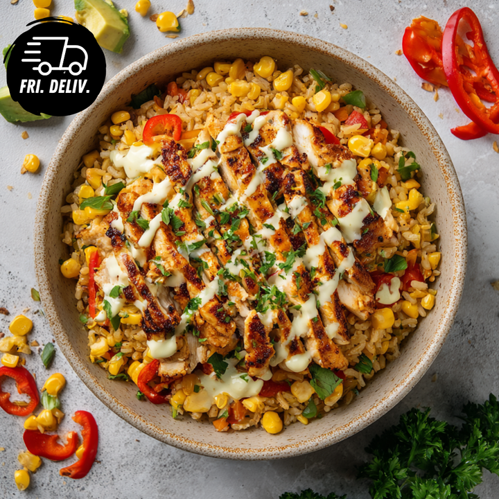 Dive into a bowl bursting with bold, vibrant flavours and satisfying textures with our Chicken Fajita Bowl, a feast for the senses that transforms everyday ingredients into a gourmet experience. Succulent strips of chicken are marinated in smoky, aromatic spices and seared until golden, delivering a juicy, flavour-packed bite every time. Roasted red capsicum and sweet corn kernels add a natural sweetness and crunch, perfectly balancing the warmth of the spiced chicken.